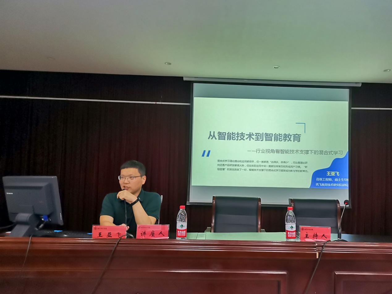本网讯(教科院 文/图 王薛晴)5月31日下午4点,科大讯飞高级工程师、西北师范大学专业学位博士研究生实践指导教师、安徽师范大学专业学位硕士生导师、讯飞教育技术研究院副院长王亚飞应邀来我院做题为“从智能技术到智能教育——行业视角看智能技术支撑下的混合式学习”的学术讲座。本场讲座于我校赭山校区图书馆报告厅举行,由我院肖文副教授主持,教育技术学专业师生共计70余名到场聆听学习。