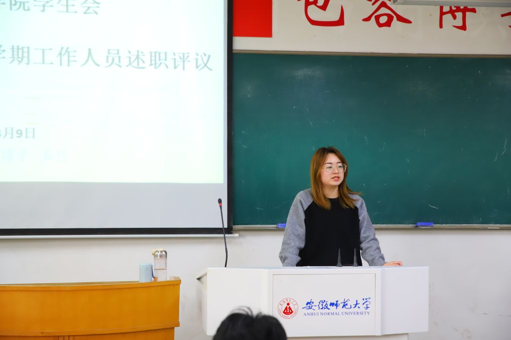 会上,学生会主席团成员、各部门负责人等28人轮流进行工作述职。各汇报人通过PPT总结第一学期部门工作开展情况,分享工作经验与感受,同时提出了第二学期的目标与展望。学生会主席团成员任子贤从磨练工作能力、注重思考能力以及加强学习能力三个方面展开汇报,强调学生会工作人员应该不断提高个人能力,彰显青春担当。文艺部负责人何静雯总结了个人工作经历与获得荣誉,提出学生会工作人员应该强化自身学习,提升工作能力,认真履行职责。