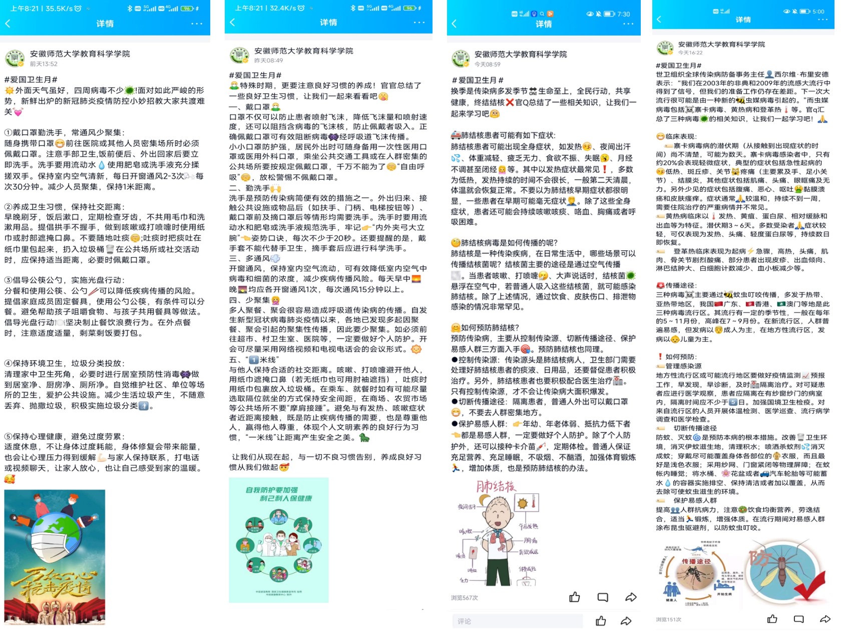 为提升教科学子的卫生文明意识,强化卫生科学知识的普及,教科院通过官Q、微信推文的方式进行爱国卫生月科普宣传。其中,官Q发表肺结核预防措施、虫媒病毒科普知识以及新冠肺炎防控妙招,助力同学们形成良好卫生习惯,加强自身防护;微信公众号发布“文明健康、无疫无疾”爱国卫生月相关微信推文,开展疫情相关知识普及活动,提高同学们文明与健康意识。相关科普宣传致力于深化同学们注重卫生的素养,加强自身健康管理,掀起了爱国卫生月人人参与的浪潮。