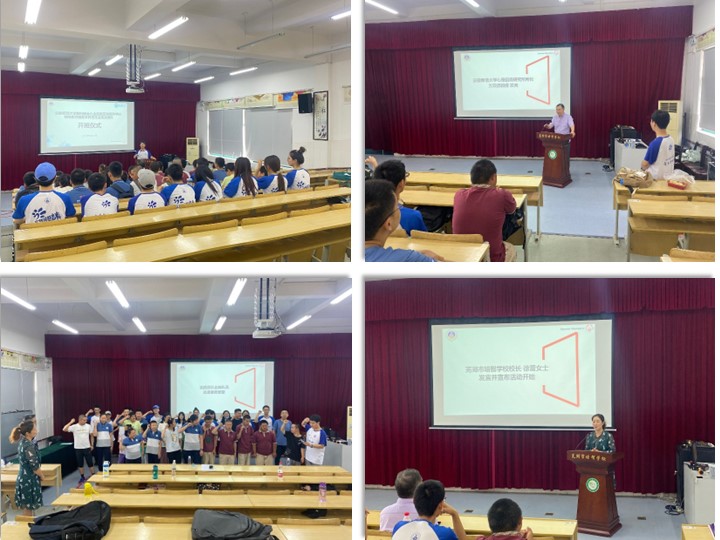 6月27日上午,实践团队在芜湖市培智学校阶梯教室举行了开班仪式。团队指导教师安徽师范大学心理咨询研究所所长方双虎,芜湖市培智学校校长徐蕾、团支部书记张康出席了开班仪式。