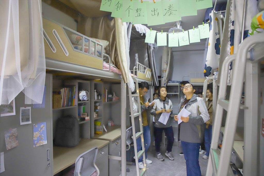杜凤在寝室与同学们亲切交谈,了解同学们的学习和生活情况,提醒大家要营造良好的寝室氛围,保持寝室环境的整洁,努力将寝室变成学习、生活、情感的共同体,保持“早睡早起,每日锻炼”的好习惯,在温馨的宿舍生活中收获友情与成长。