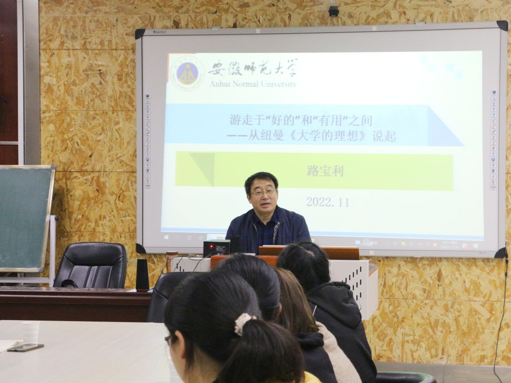 2022年11月18日晚,365英国上市官网团委于田家炳教育书院8502教室组织开展第二十四期“教授友约”活动。本次活动邀请了教育学专业教授路宝利到场,与同学们进行有关“好的与有用——从纽曼的大学的理想说起”的内容分享。