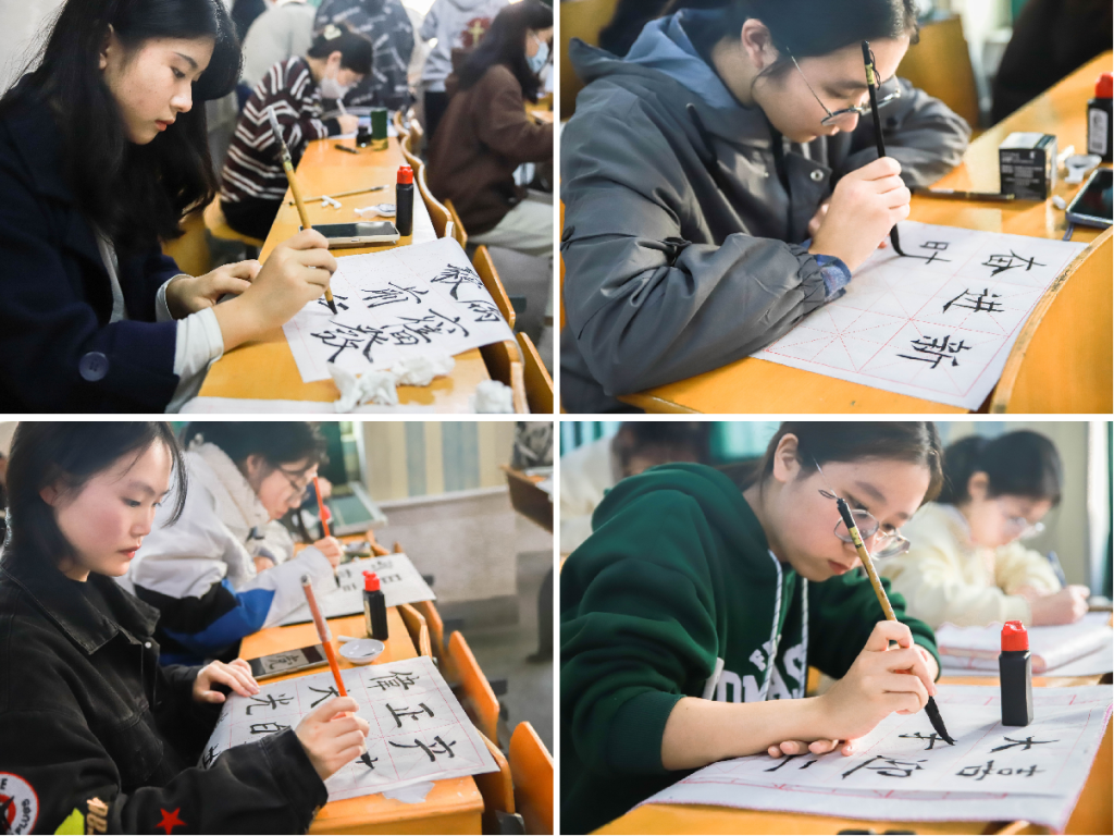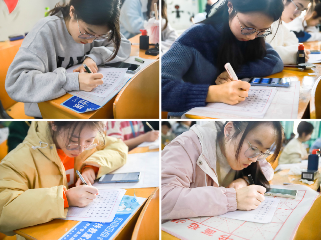 比赛过程中,同学们坐姿端正,神情专注于汉字的一笔一划。在同学们的笔下,毛笔字起承转合,一撇一捺之间尽显书法的刚与柔;钢笔字藏锋展势,一张一收之间流露汉字的苍劲有力;粉笔字方正严谨,一笔一划之间尽是笔画的规整大气。比赛结束后,工作人员将参赛作品统一收集交至评委老师处。