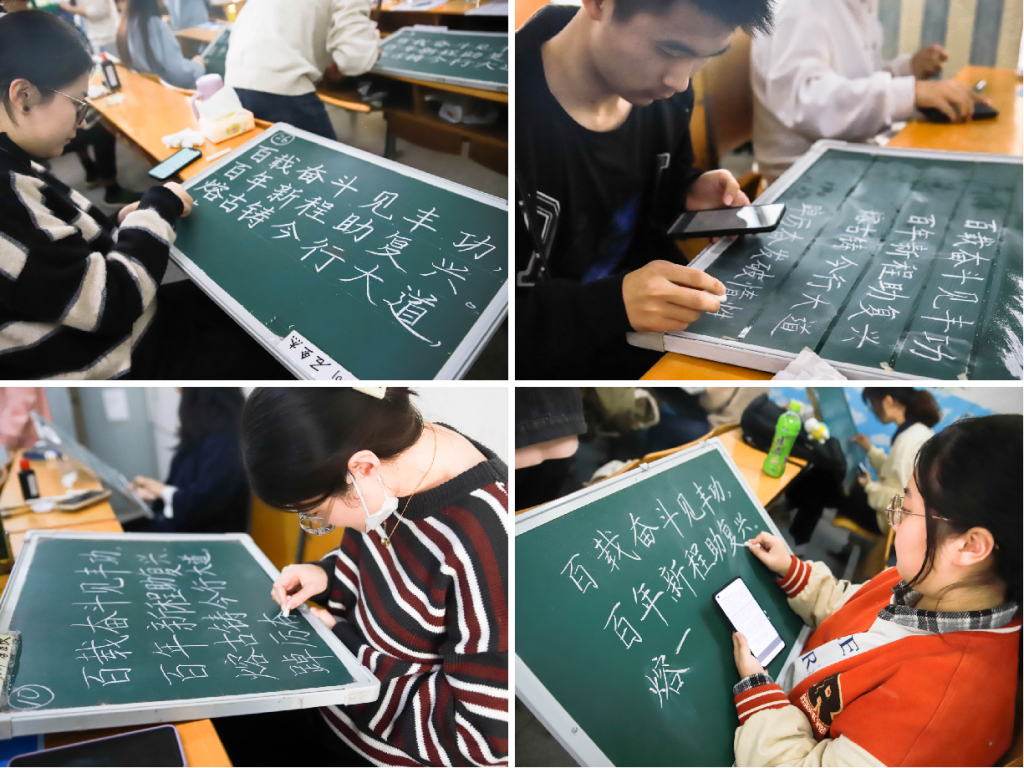 本次大赛主题为“学习二十大、永远跟党走、奋进新征程”,旨在弘扬二十大精神,激励当代青年踔厉奋发。比赛分为三个部分,分别是毛笔字、钢笔字、粉笔字,参赛选手分成甲乙两组同时进行比赛。