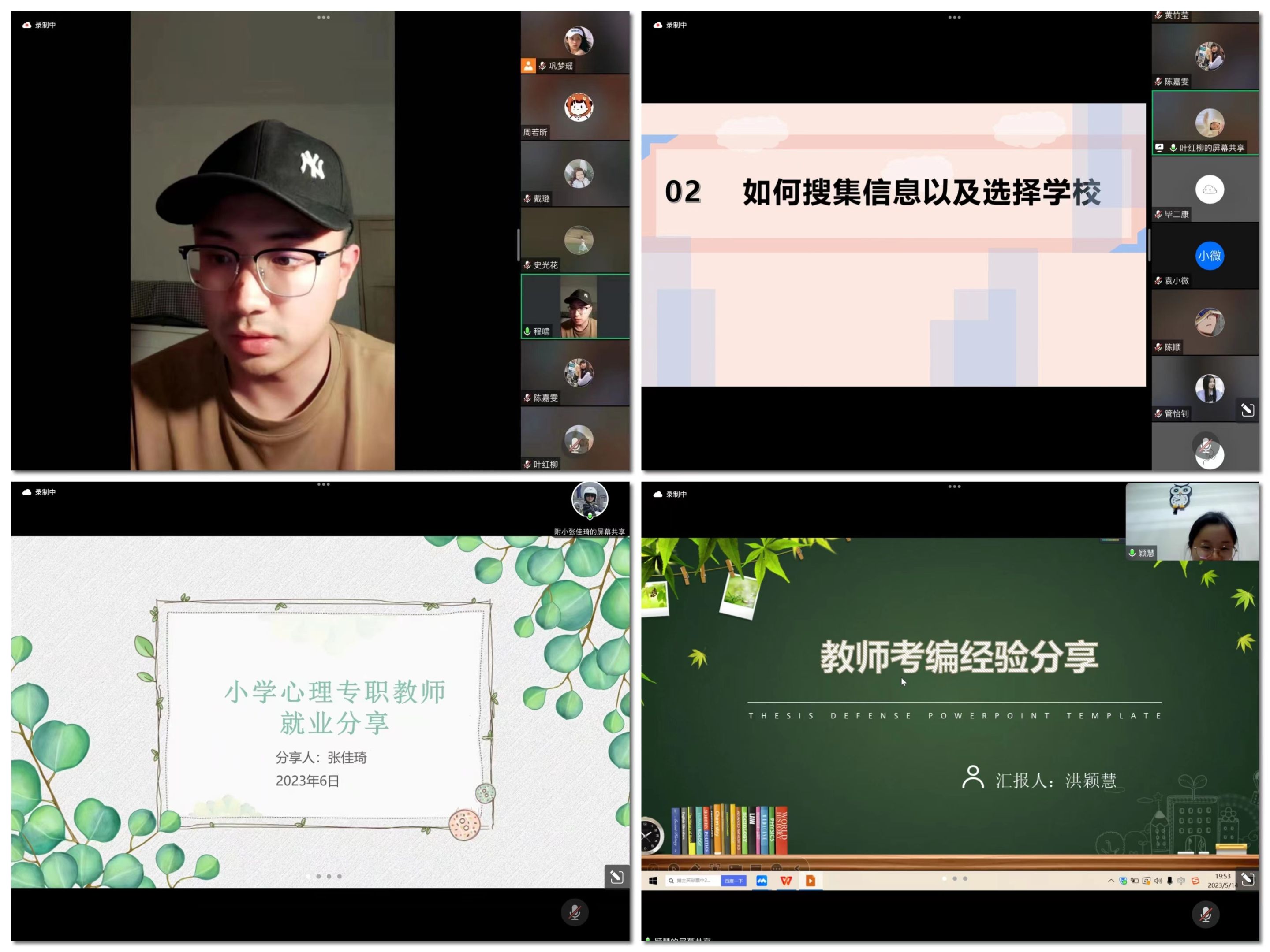 叶红柳结合自身考编历程,从前期准备、信息搜集、学校选择和心态调整四方面展开,鼓励大家坚定一个目标,进行多次尝试,多积累经验,在面试时磨练应试技巧,提高人际沟通与语言表达能力。张佳琦则从“选择”和“努力”切入,提出在努力的前提下选择很重要,强调对于心理学专业的同学而言,心理学科的编制考试需要较强的信息搜集能力,建议同学们尽早准备,多次磨练试讲。洪颖慧为什么考如何备考两大方面展开,通过对题型的讲解分享答题技巧,并推荐了一些可供参考的招聘渠道,建议同学们时刻关注各个地区的招考信息和考试范围,把握报名机会。
