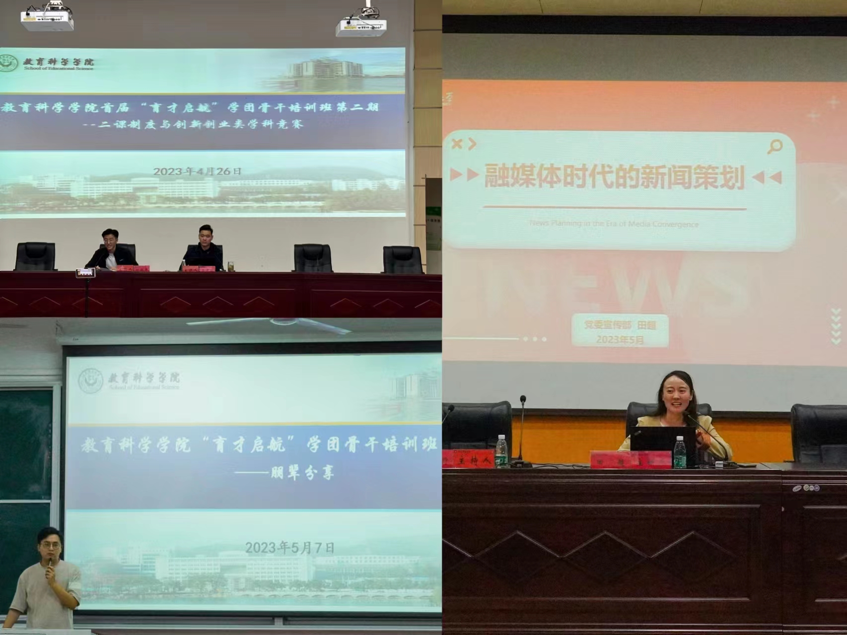 强化技能训练是提升学生综合素质的重要途径。校团委办公室主任王申振开展《二课制度与创新创业类学科竞赛》专题讲座,详细讲述了二课制度以及相关的竞赛,鼓励各位同学勇于创新,乐于挑战。校党委宣传部网宣办主任田超在《融媒体时代的新闻策划》专场讲座中以宣传思想工作的意义、融媒体时代的宣传趋势及新闻定义的再出发三个方面全方位讲解了新闻策划的过程,勉励各位同学不断提升宣传能力和媒介素养。教科院研究生辅导员程啸结合活动的策划与现场的汇报进行“台前幕后的结合”专题讲座,从学生的实际出发解决策划与汇报重难点问题。教科院心理学系副教授谢宇在“心理学在人际交往中的应用”讲座中强调把握人际交往的重要性,掌握人际交往的技巧,养成团结合作的优秀品质。培训班还举行了朋辈分享交流会,发挥朋辈力量,树立青春榜样,各位同学在持续的学习中升华思想,精进技能。