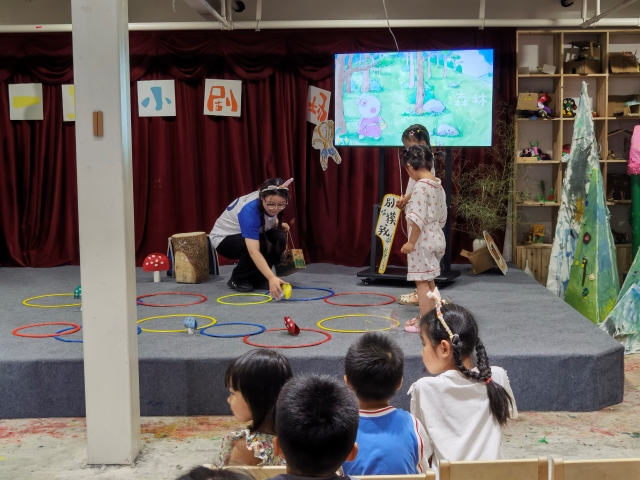 绘本剧表演的过程中,团队的成员们的表演极具吸引力和表现力。队员们把“采蘑菇”的故事情节游戏化,转变成趣味的互动吸引幼儿的兴趣,并通过生动形象的表演将所扮演角色的性格特征生动化和趣味化,用符合幼儿身心发展表演方式让幼儿深刻领悟到绘本剧的内容和要传达的意图。在这种形式的表演之下,小朋友们沉浸绘本剧其中,在表演的过程给予了特别多积极、正向的反馈。小朋友们的语言、动作、肢体协调等能力也在富有趣味互动过程中得到充分地发展。绘本剧表演的最后,队员们也同小朋友们进行了积极、友好的互动。