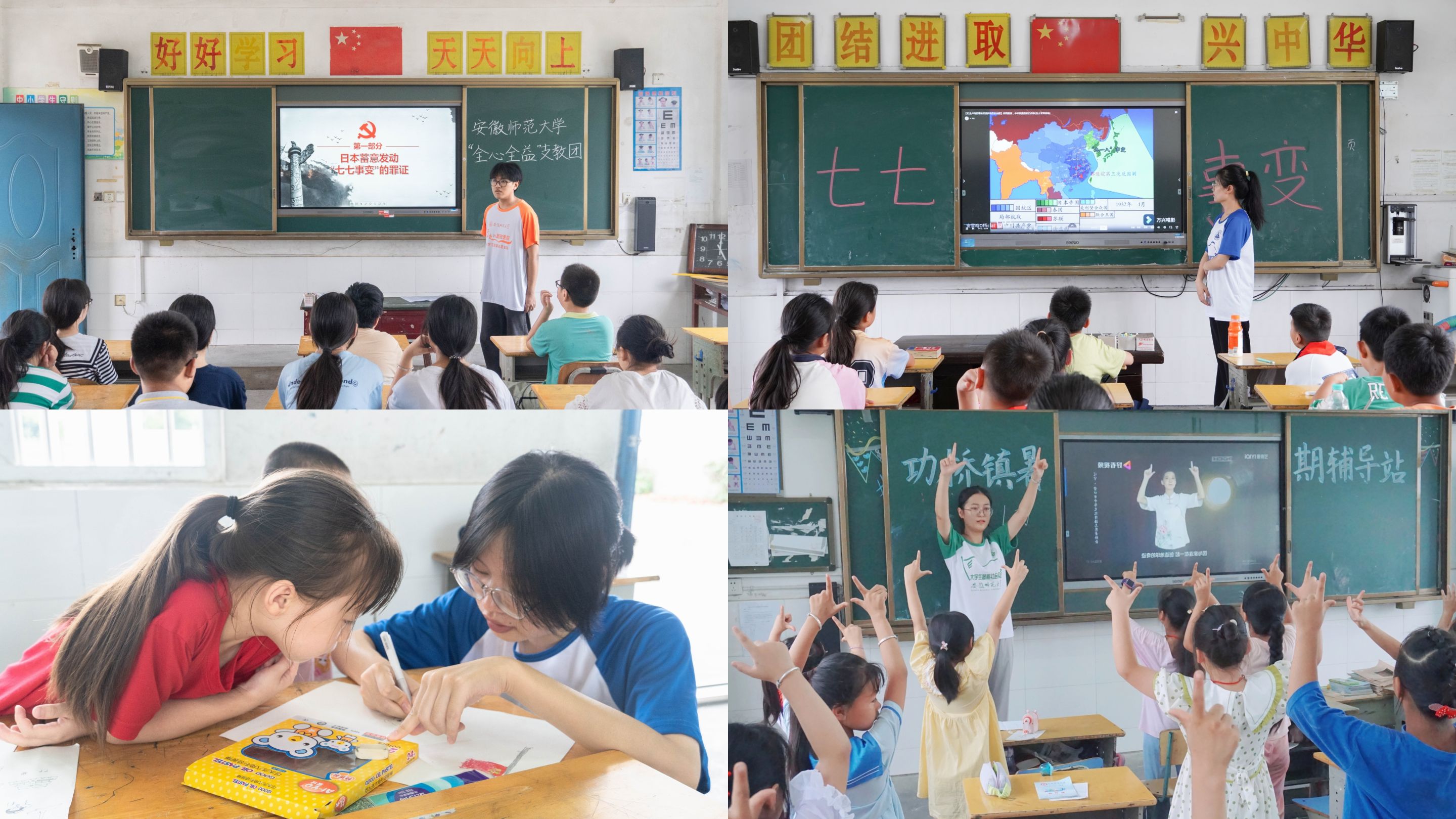 悼念同胞,缅怀先烈。“全心全益”和县志愿支教团队在各支教点组织进行主题活动,开展“七七事变”专题课程,向同学们介绍了“七七事变”发生的原因和全国抗战开始的前后经过,重温中华民族的抗战历史,致敬那永不妥协的抗争,在历史中追寻红色基因、汲取奋进力量。同时,志愿者通过生动有趣的手势舞课程,帮助同学们牢记历史、汲取精神、自立自强。除专题课程外,支教团通过开展专题美育课程“我和我的祖国”,唤起学生的爱国情怀与家国认同感,增强学生的责任意识。