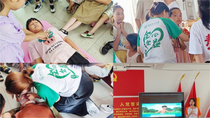 通过观看溺水自救视频结合蓝天救援队的老师的悉心讲解,学生们认真学习溺水自救方法。同时,在实践成员们的带领下,同学们一同欢唱溺水自救歌,牢记“溺水勿自慌,迅速离现场。清除口鼻保畅通,拍打后背让肺畅。若无呼吸人工上,若无心跳挤心脏。 赶紧换上干衣裳,尽快送到病床上。”