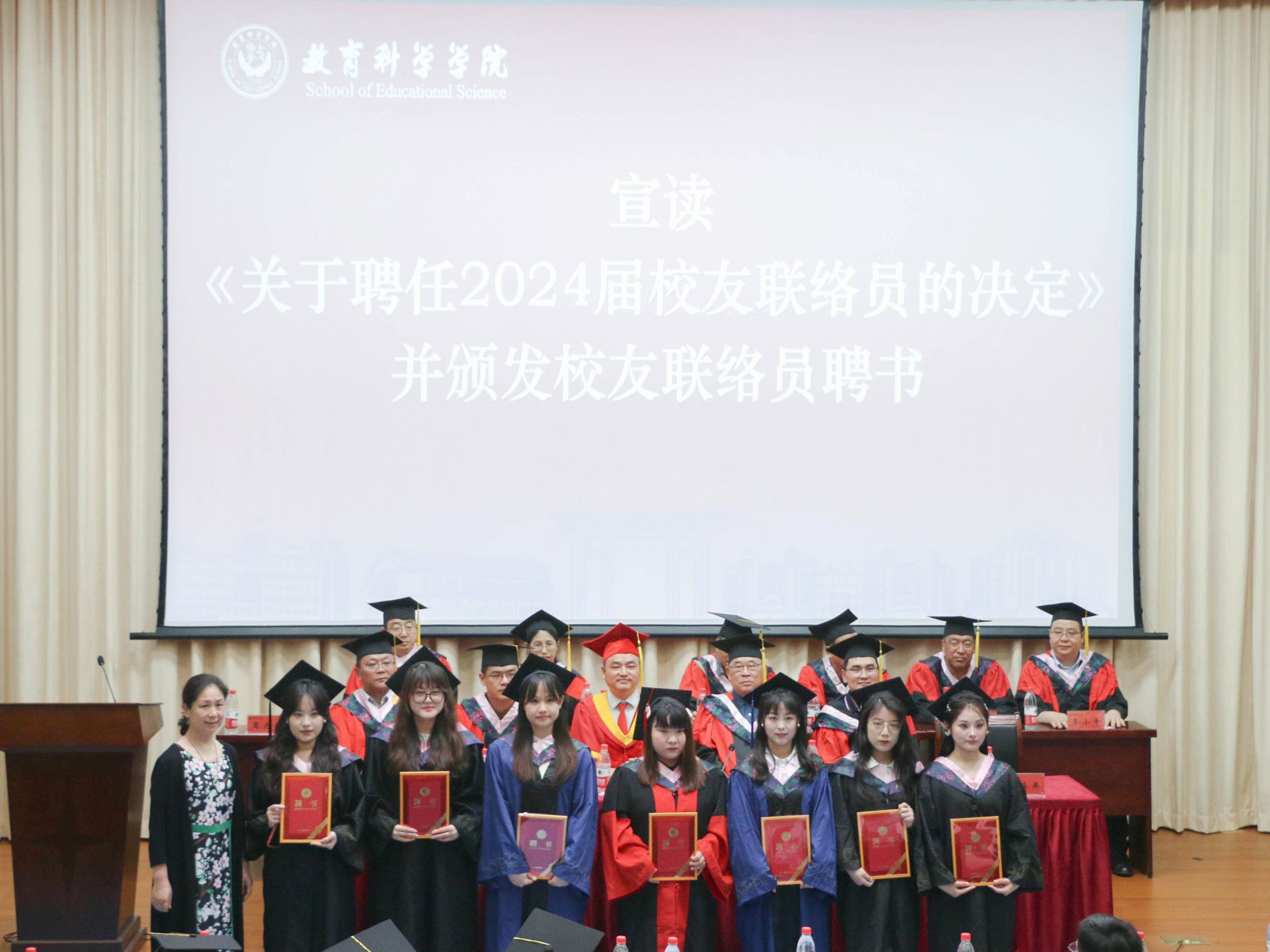随后,副院长何海燕为校友联络员代表颁发聘书。各位老师为毕业生拨穗并合影留念。