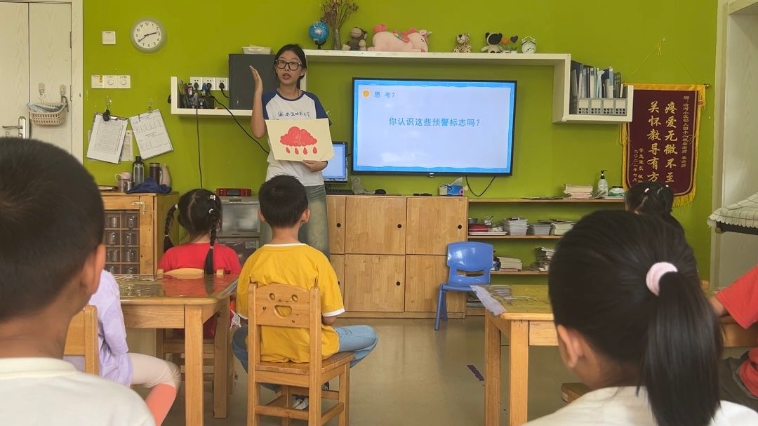 在课程正式开始之前,队员进行活动导入环节,用提问的形式拉近与孩子们的距离,营造一个温馨放松的教学环境,并结合图片材料与动画材料使幼儿接受直观性知识,符合其年龄阶段的具体形象思维,接着从“极端天气的危机”“饮食安全要注意”与“炎热中暑需严防”三个模块开展安全教育课程。在对幼儿进行夏季极端天气的知识拓展时,队员使用图片材料与操作材料,让幼儿在思考、讨论、探索中加深对知识的掌握与运用。在进行夏季食品安全教育模块进行讲解时,队员积极调动幼儿的已知生活经验,让幼儿将知识与生活相结合,更好地强化记忆、理解知识。在“炎热中暑需严防”中,队员向幼儿阐述了中暑的症状、应对措施以及预防措施,幼儿在积极回答与交流中表达自己的看法与观点,在锻炼了思维能力、探索能力的同时,也掌握了中暑预防的小技巧。课程结尾,队员提出让孩子们思考在此次安全教育课上都学到了什么,孩子们积极踊跃地回答问题,分享自己的收获与感悟,队员提出期望与活动延伸,希望小朋友们能回到家中与自己的爸爸妈妈分享安全知识,促成家园共育,达成多方联动,形成保护幼儿健康安全快乐成长的“合作网”。