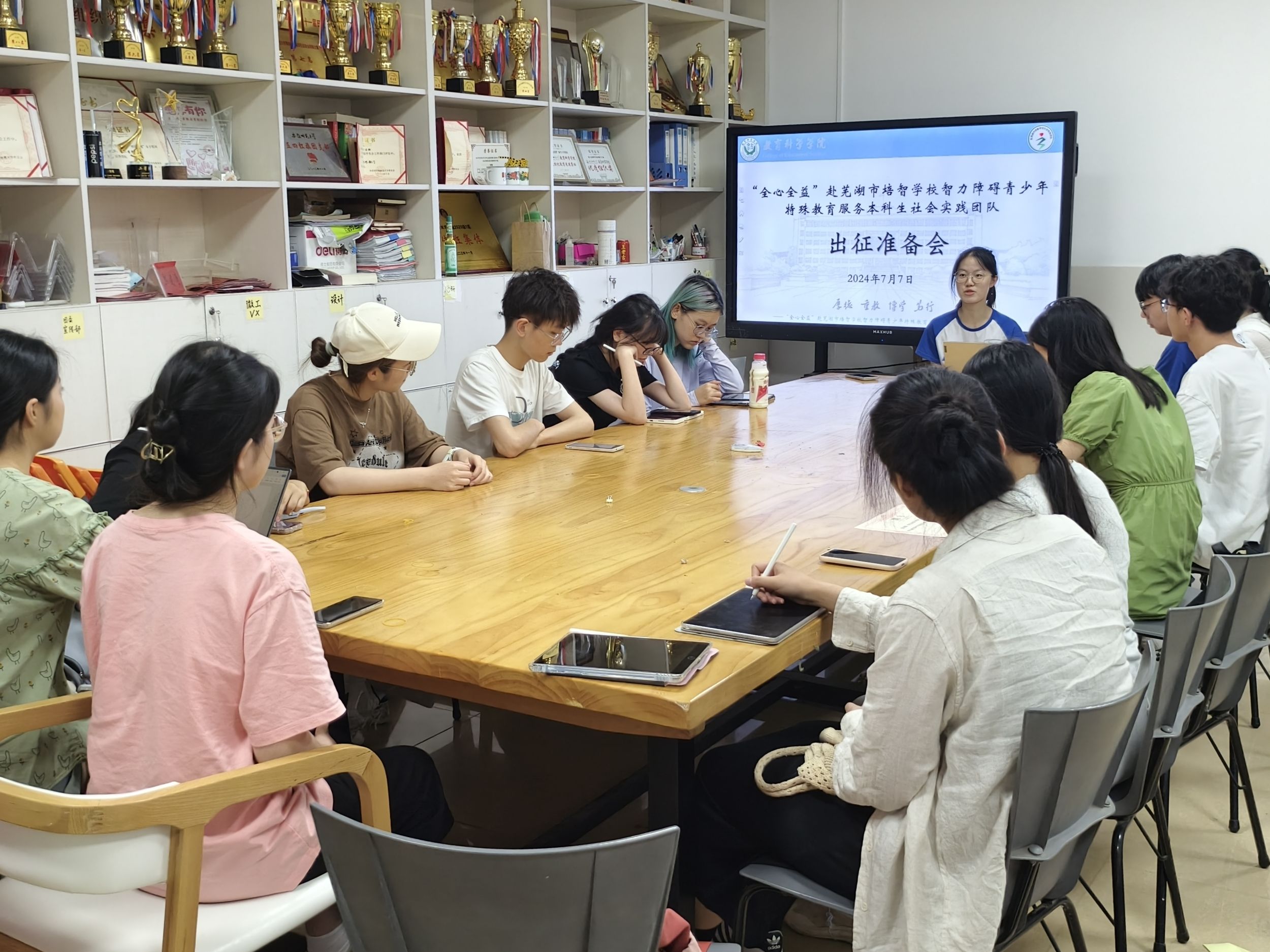 2024年7月8日晚,团队负责人孙婕妤组织召开出征准备会,首先介绍了团队前期准备概况,团队成功入选国际特殊奥林匹克委员会东亚区直推融合项目、“推普助力乡村振兴”全国大学生暑期社会实践志愿服务团队、芜湖市“芜聚青春 共创未来”优秀大学生社会实践团队与校级重点团队。其次为团队成员详细介绍开班仪式流程,从教学团辅课程、成员分班、后勤安全、未来展望等方面具体讲述后期暑期社会实践活动开展的各项安排,为暑期社会实践活动顺利进行打牢坚实基础。