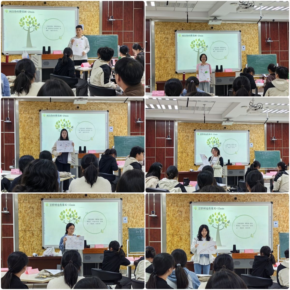 破冰分享环节中,大家根据你觉得最符合自己或者自己最想拥有的正向品质”完成分组,在自我介绍和互动分享中发觉属于自己小组品质的延伸故事和词意。随后画出赞美树环节,通过小组的分享,金凤仙引导大家从新的角度欣赏自己,提醒自己拥有的品质,告知自己“美好,都不是理所当然的”。“歪脖树也有春天”环节中,大家集思广益,通过发掘小组随机抽取的负性词条中可能存在的正向品质,给予“歪脖树”新的内涵。总结环节中,金凤仙提醒学生“完美是理想,更好是现实”,接受自己的不完美,接纳还可以更好的自己,成就更美好的自己。
