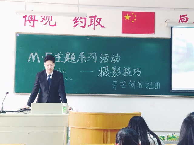 本网讯(教科院 文/李雅馨 图/徐礼潜)为普及摄影基础知识,提高社团成员摄影技能,青芒创客协会39日下午于田楼8305教室举办“M·E”主题系列活动——摄影技巧。2017级教育技术学专业陈思宇应邀担任主讲,部分社团会员到场学习。活动由会长濮楠楠主持。