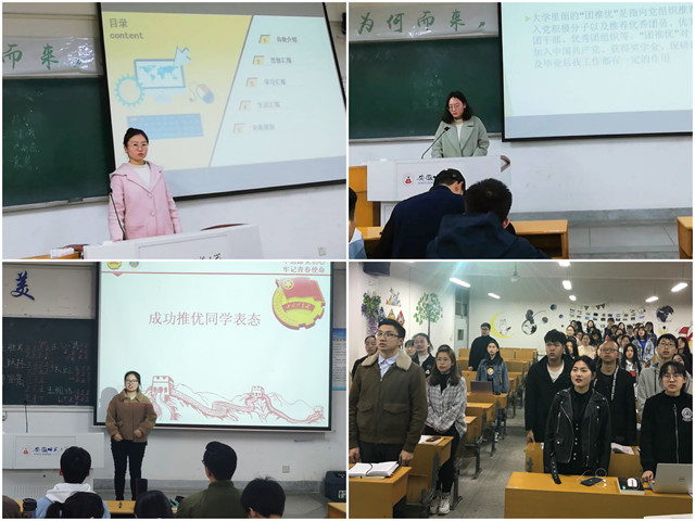 会议伊始,主持人上台宣布团推优大会开始,全体起立,共唱团歌。此后,由辅导员程啸老师介绍会议主要流程和选举要求,强调公平、公正、公开地选出推优对象。主持人讲解团推优的定义及推优标准,并组织推优候选人依次上台作自我称述,陈述内容真实、态度诚恳、愿望强烈。各候选人从自身的思想、学习、工作、生活等情况作简要介绍,反思过去、做好现在、规划未来,以自身行动树立团员榜样,以诚恳言语陈述入党期盼。演讲完毕之后,在场团员可对候选人进行提问,以更加了解推优对象的思想及生活。随后,主持人组织发放民主表决票,全体同学投票,班委进行唱票,整个活动公开透明,同学们对此结果也毫无异议。