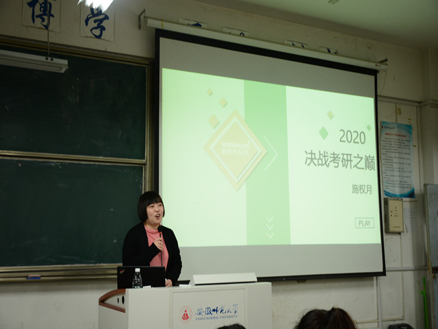 首先,施老师对近十年的考研报名人数在不断增加,而招生人数没有增多的考情进行分析,从而得出考研升学难度在不断增加的结论。她强调考研是一场选拔性的考试。接着,施老师立足于教育学的视角,从专业设置与学校选择两方面进行客观分析。一是研究生报考分为专硕与本硕两大类,其中具有一定的区别。二是报考学校的区别,分为师范类与综合类,分为A类地区与B类地区。然后,施老师为同学们解读了考研流程与考研时间安排:9月中旬大纲公布、9月24-27日和10月10-31日两个时段进行网上报名、11月份进行现场确认、12月22-23日进行初试、次年3-5月份进行复试,以及初试时间、科目安排和复试时应该注意的问题。最后,施老师强调考研的重要性,劝告同学们要提早准备。