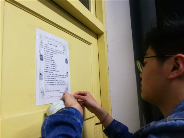 此外,为了响应学校的号召,增强学生的文明意识,各班班委在班级宣传明德修身“十学会”、校园文明“十不为”的行为准则。同时,由学生会生活部牵头,学院在各寝室张贴文明规范的宣传单,积极创建和谐宿舍,将“文明修身”的推广落实到具体行动、体现在每个角落。