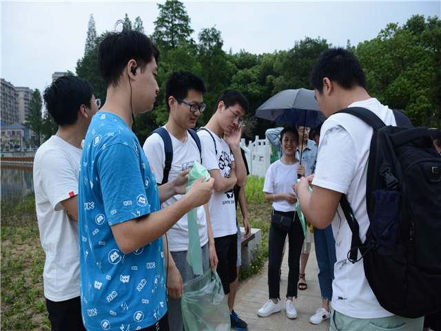 早上九时许,班级同学依次到达汀棠公园东南门,在班长和安全委员的组织下同学们有序地排成长队,准备开展今天的活动。先由安全委员为班级成员发放环保袋,接着同学们便打开易班的易运动,记录志愿服务过程中自己的脚步。