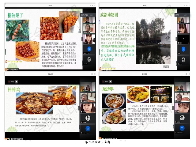 第三次宣讲的对象是一名二年级留守儿童。基于宣讲对象对成都这座城市的浓厚兴趣,团队成员根据学生性格特点、兴趣爱好为其量身打造了一条成都云游路线。两位宣讲老师刘淼、李彦翔为学生展示了成都动物园和众多美食。宣讲成都动物园的过程中小朋友热情满怀,与宣讲老师积极互动,学习到许多动物知识。之后,两位宣讲者为她介绍了龙抄手、糖油果子、棒棒鸡、豆花、甜水面、钟水饺等成都的美食。美食介绍充分迎合了孩子的爱好,满足了学生对成都美食的兴趣。整个宣讲过程中,小朋友开朗活泼,兴致高昂。团队成员通过宣讲加持了学生的好奇心,鼓励孩子积极探索。