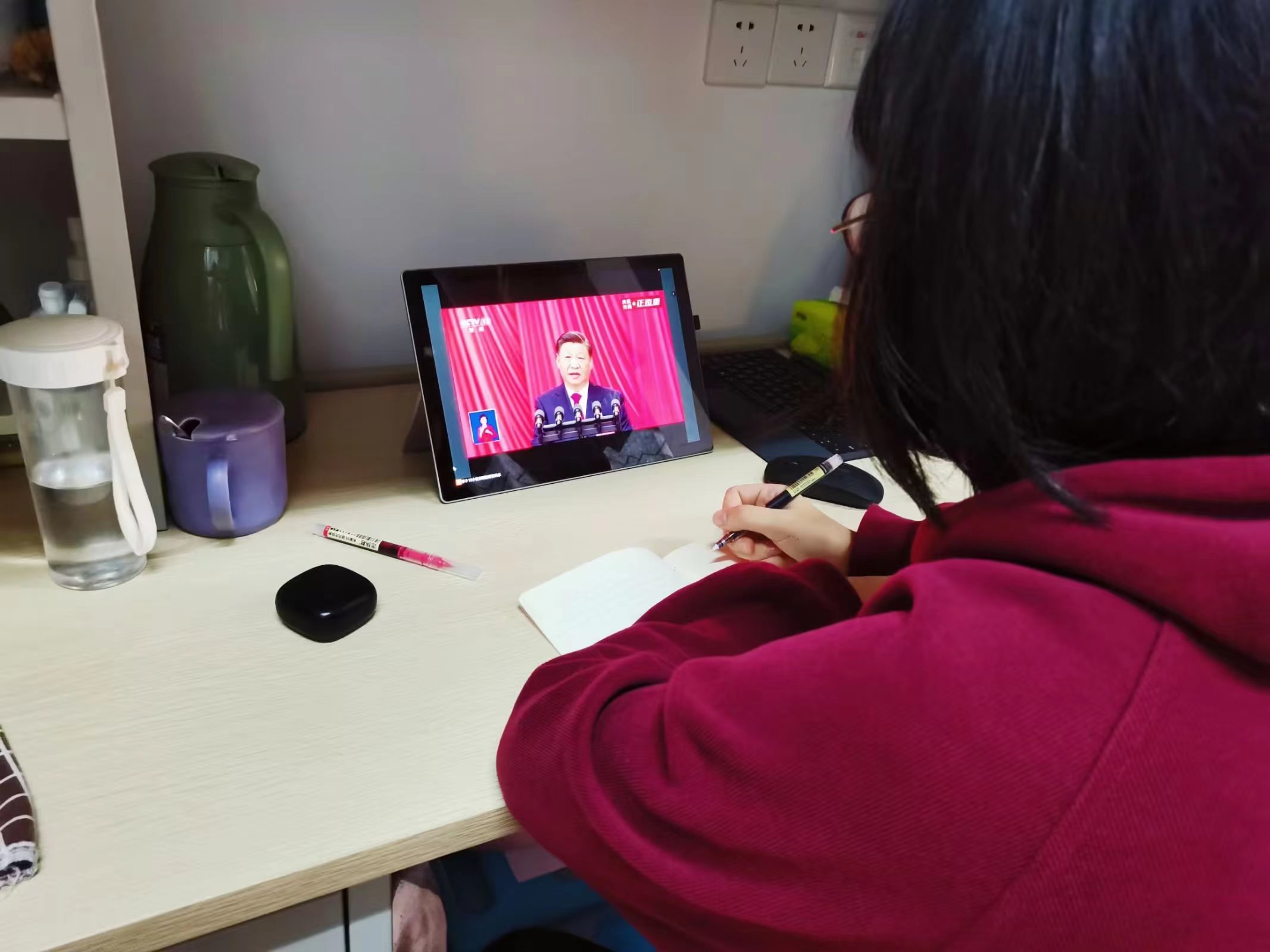 在收看过程中,党员同学们精神饱满、全神贯注认真聆听报告,并认真地做笔记。