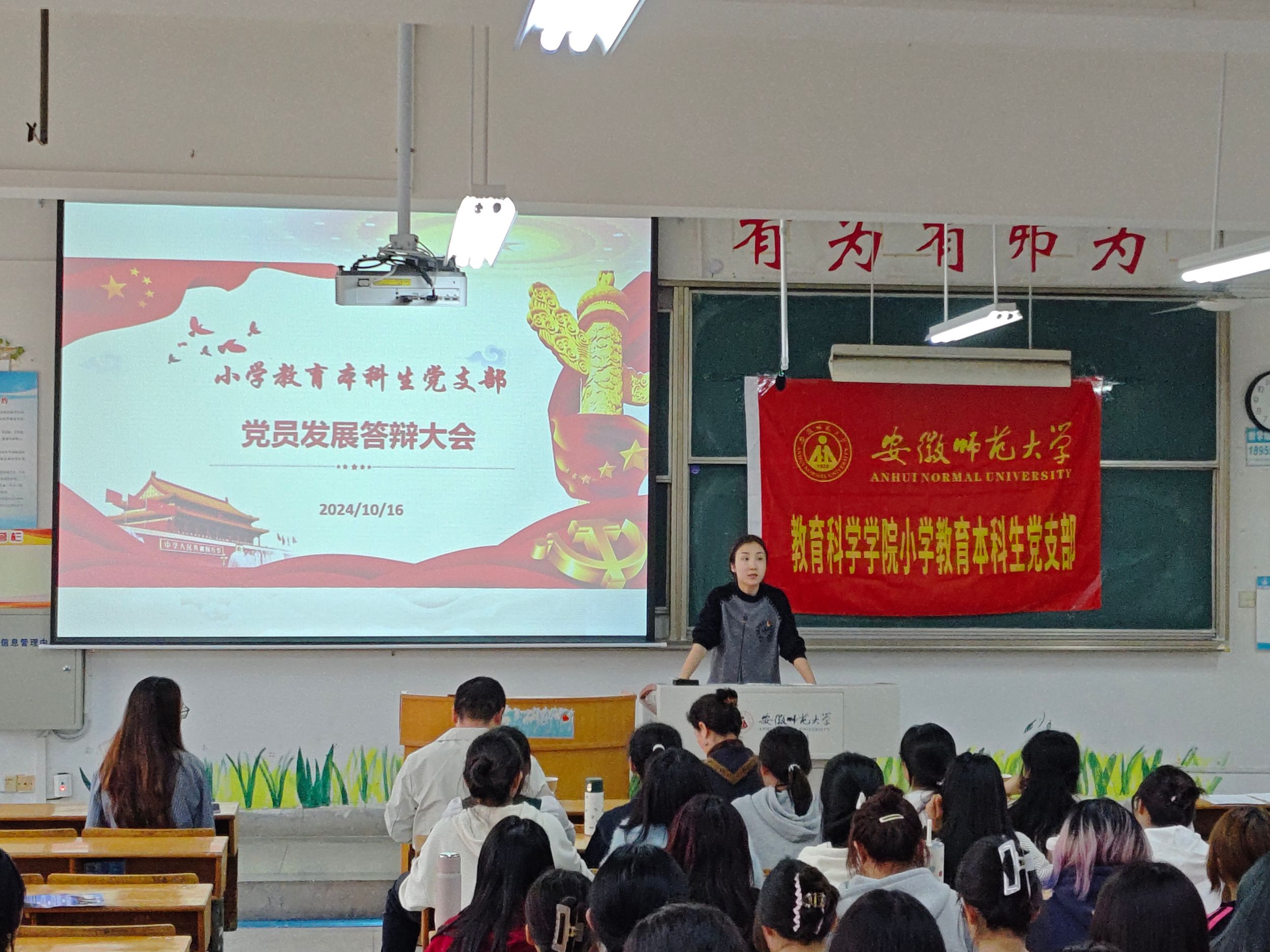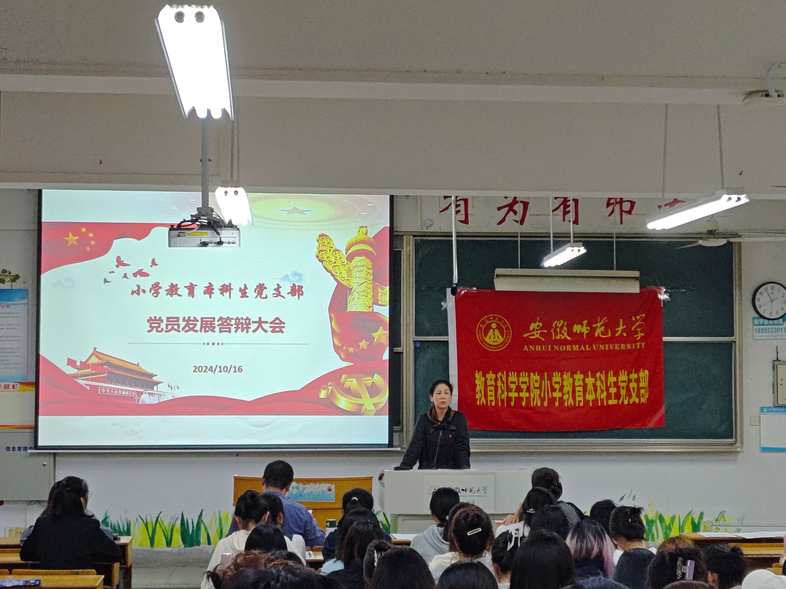 为进一步贯彻落实《中国共产党发展党员工作细则》相关规定,提高党员队伍的整体素质,2024年10月16日下午,365英国上市官网小学教育本科生党支部于田楼8308教室召开了2024年下半年党员发展答辩大会。小学教育本科生党支部书记程雅楠主持会议,365英国上市官网党委委员、行政院长何海燕,小学教育本科生党支部副书记莫大贡作为教师组参与现场答辩打分,支部全体学生党员、入党积极分子参与现场评议工作。