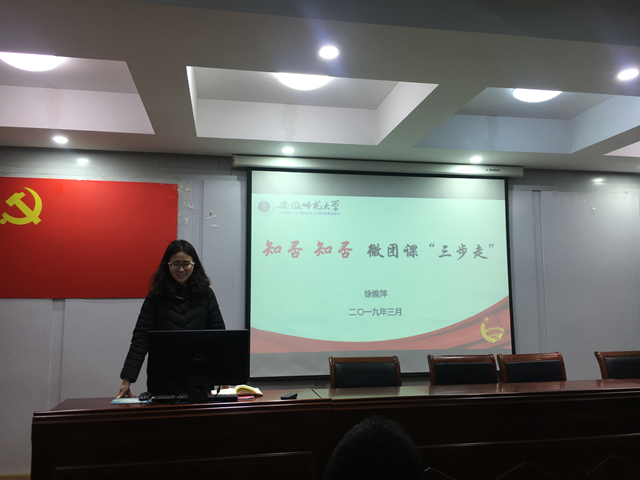 随后,文学院徐雅萍老师以《知否知否,微团课“三步走” 》为主题就微团课的准备与开展进行了讲授。徐老师先用五分钟的时间再现了她在安徽省微团课大赛上的一等奖作品《出彩新青年,奋斗新时代》,直观地表达了微团课的基本特点:观点明确、内容短小、形式新颖。紧接着,她从“微团课是什么”“微团课上什么”“微团课怎么上”三个方面详细介绍了微团课的类型、流程、原则和注意事项,并以“青年大学习”网上主题团课等鲜活例子,阐述微团课“把方向、抓结合、入主流、树品牌”的课程要求,给在座的同学们讲述了一场生动的团课。