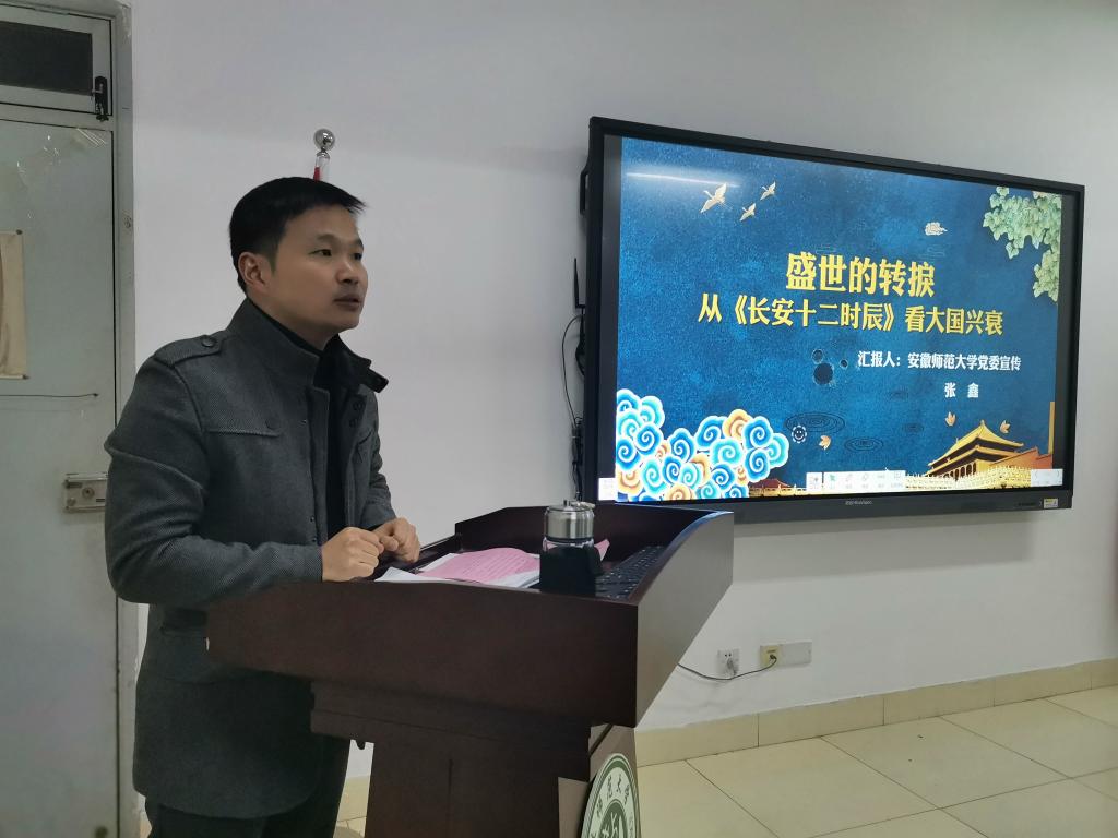 张鑫老师首先以当前中美贸易、香港暴乱等热点话题为引,提醒同学们要在纷繁复杂的舆论宣传中把握时代脉络,理清思想认识。他告诉同学们读史阅世能够知兴衰,并向同学们分享如何读史。随后,张鑫老师围绕假期网络热播剧《长安十二时辰》展开,结合众多历史资料和故事,向同学们详细介绍了中国古代盛世的“顶点”、“痛点”和“拐点”,并带领同学们从一个崭新的角度认识中国历史。在余论中,张鑫老师从政治、经济、贸易和科技四方面简略介绍了当今中国的发展,呼吁同学们树立文化自信,勇立时代潮头,担当民族复兴大任,为社会主义建设添砖加瓦。