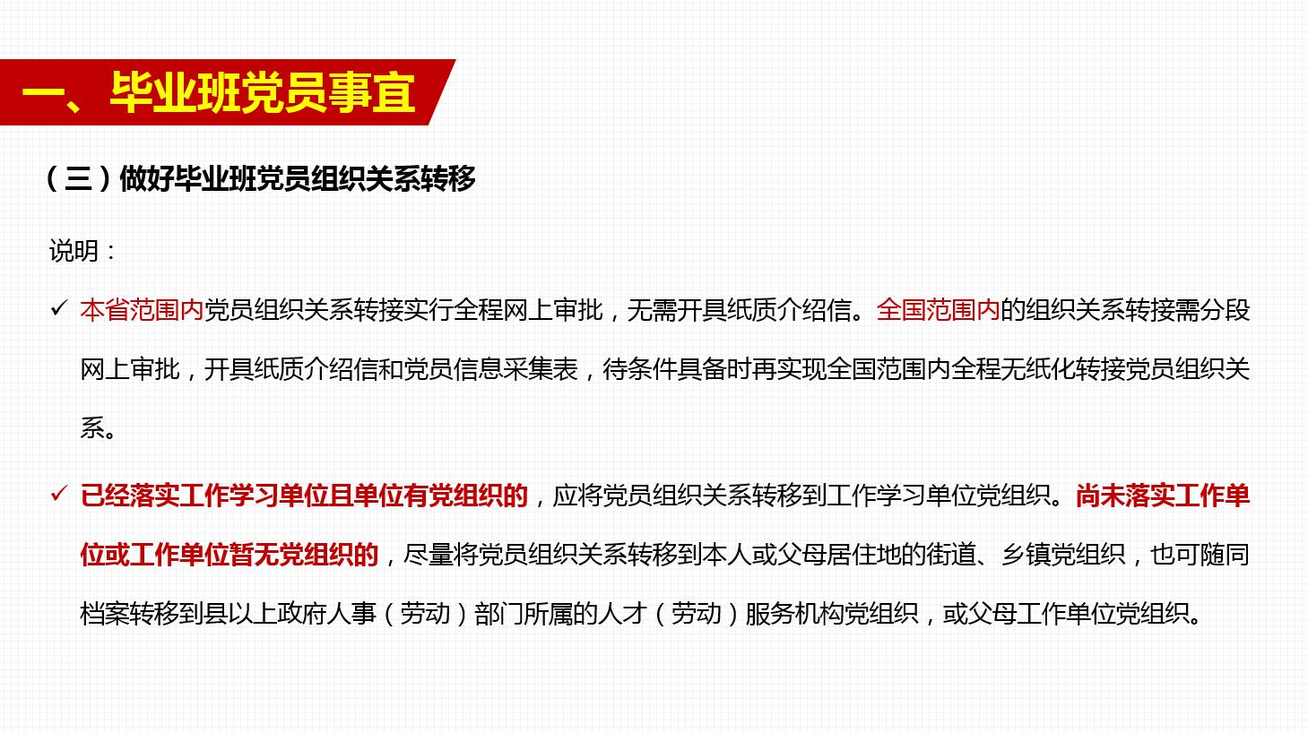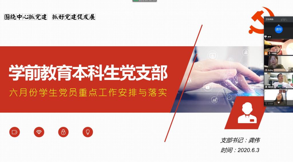 临近毕业,为加强思想教育,重点做好党组织关系转移教育,支部书记龚伟老师于63日组织开展了线上专题学习,通过PPT讲解与答疑两种方式全面帮助毕业班党员做好档案归档以及党组织关系转移工作的落实,指导毕业生党员规范准确填写《2020届毕业生党员组织关系转移登记表》和《毕业生党员组织关系转移情况统计表》,防止出现“口袋党员”“失联党员”。学习会上,针对大家提出的种种问题,龚伟老师均给予了耐心细致的解答,力求前期弄清楚,后期少问题。
