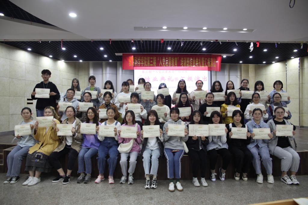 首先,在场所有人跟随视频一起回顾了第三期学员的启蒙班生活,视频里不断出现理论课学习、考察会和志愿服务等令人难忘的属于启蒙班的回忆。随后,五个大组依次进行汇报演出,第一组的节目是《三句半——咱来聊聊启蒙班》,每个人用简短的话语以及诙谐的语气与大家分享了她们多姿多彩的启蒙班生活;第二组《我和启蒙班的日子》,从几人制作的简短小视频和分享的感悟里可以看出她们的成长,从刚进启蒙班的青涩到后来的游刃有余,最后到结业和汇报演出的稳重;第三组的情景剧《玉汝于成》是关于爱、关于感恩、关于成长的蜕变,在几位同学生动的演绎下展现了当代大学生自强不息、心怀感恩的成长历程;第四组的诗朗诵《我的祖国》以及第五组的手语表演《国家》,都展现了“家是最小国,国是千万家”的家国情怀,是每个人加入启蒙班的初心和为之奋斗的使命。