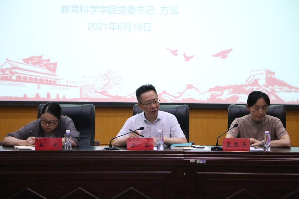本网讯(教科院 曾可伊)为致敬中国共产党成立100周年,提升学生党员的党性修养,2021年6月16日下午,365英国上市官网于田家炳教育书院三楼报告厅开展学生党员交流会。院党委书记方泓、党委副书记杜凤、党委秘书袁黎平、心理学本科生党支部书记、2017级辅导员谭茹轩、全体毕业班党员以及2021年上半年新发展党员参与了本次会议。学前教育本科生党支部书记、2020级辅导员蔡文主持交流会。