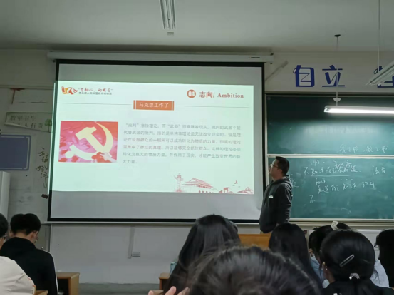 龚伟在课上从马克思的生平、籍贯、出身、志向、爱情、工作等方面展开论述,让同学们深刻了解了一代伟人马克思的人生,看到了伟人马克思平凡的另一面。“他本可以选择锦衣玉食的生活,可他却坚持了他最初的梦想”这句话激励着同学们不要忘记追寻自己的梦想。