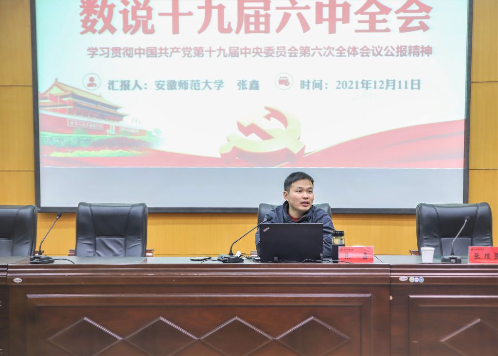 张鑫就十九届六中全会的召开背景、会议审议通过的两份文件、会议总结的重大成就和历史经验、马克思主义中国化的三次飞跃、党的百年历程创造的四个伟大成就等方面展开了深入解读。张鑫还播放了人民日报改编的短视频《少年》展现建党100周年以来新中国取得的伟大成就。他强调,实现中华民族伟大复兴是一场接力长跑。经过百年奋斗,中华民族迎来了从站起来,到富起来,再到强起来的伟大飞跃,迎来了实现伟大复兴的光明前景。