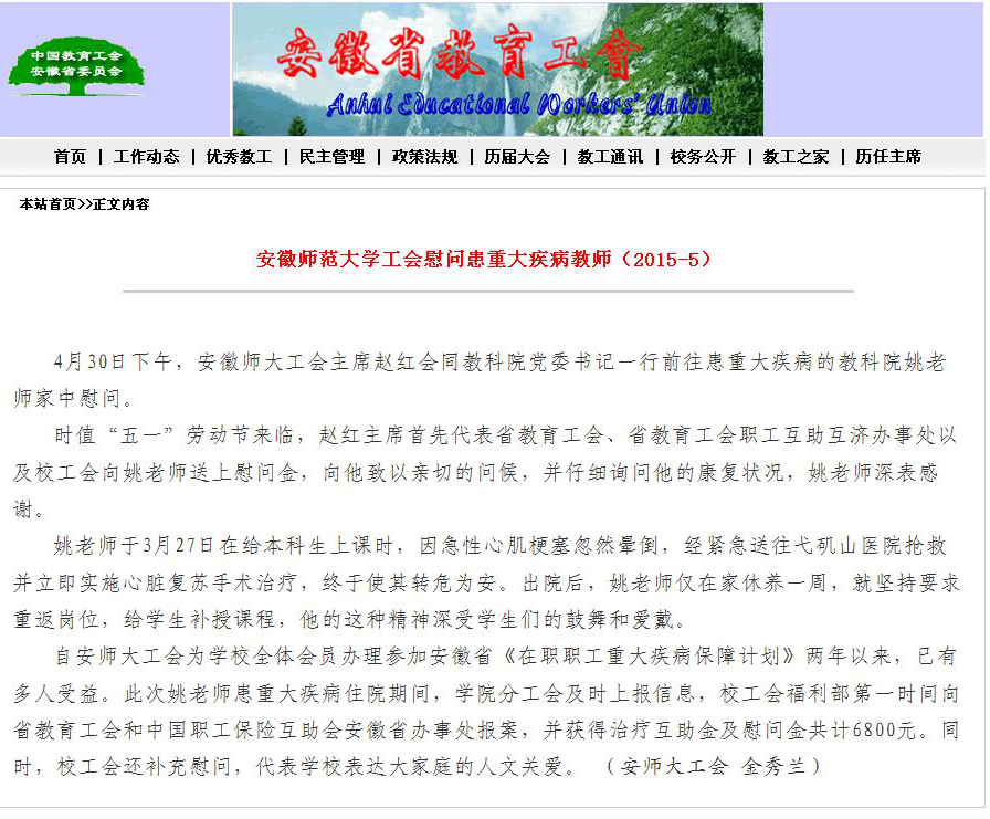 (教科院 黄引娣)5月5日,省教育工会网站以《安徽师范大学工会慰问患重大疾病教师》为题报道了我校、院两级工会共同关心我院患大病姚运标老师,为其争取到治疗互助金及慰问金的相关福利互助工作。