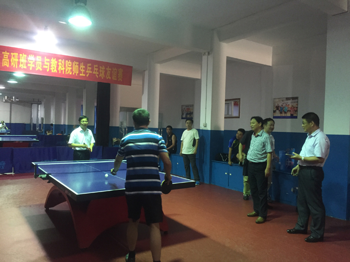 在校乒乓球馆,刚来学院参加培训的省第13期高完中校长高研班学员代表与学院教职工开展了乒乓球友谊赛。在比赛过程中,来自基础教育一线的校长们与教科院领导、老师充分发挥了各自精湛的球技,赛场气氛热烈而活跃,场面精彩纷呈、高潮叠起,友谊赛使大家提升了技艺,在活动过程中分享了快乐,也加强了培训学员与任课教师之间情感交流。